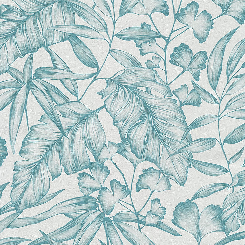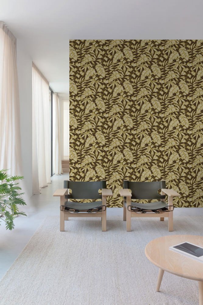 Experience a holiday in your own home. Biloba leaves will transform your living space into a tropical paradise. Bekasi botanical wallpaper is designed in various shades, from tropical bright blue to dark brown ground.
