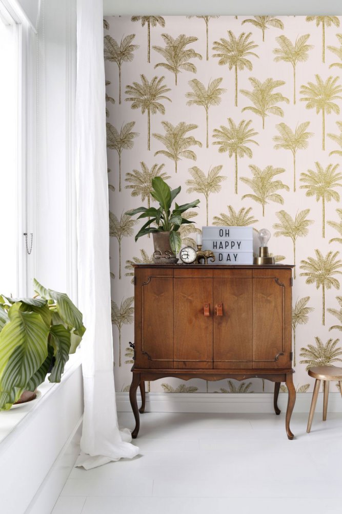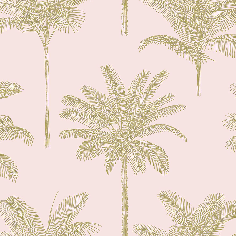 Pink non-woven wallpaper, gold outlines of palm trees.