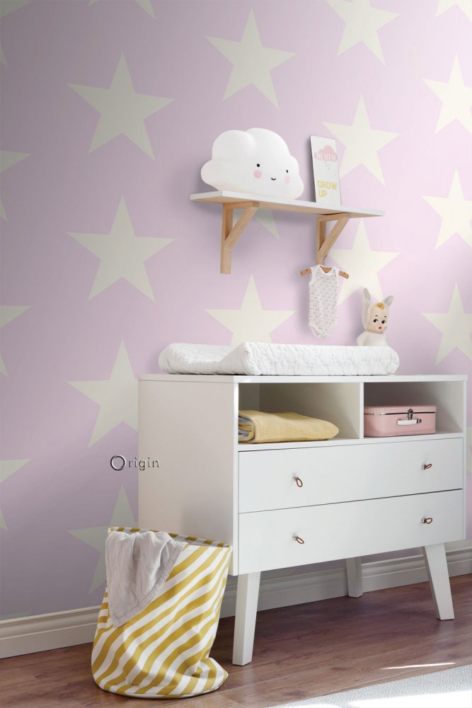 Metallic pink non-woven wallpaper with stars.