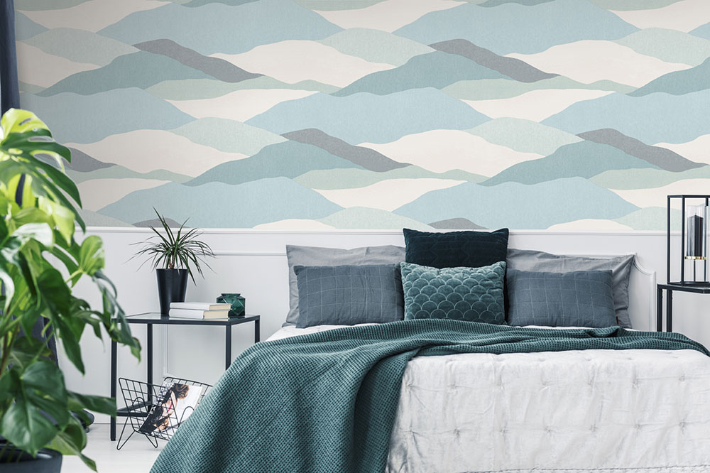 Non-woven graphic wallpaper, wave motif, mountains - shades of blue, green, turquoise.