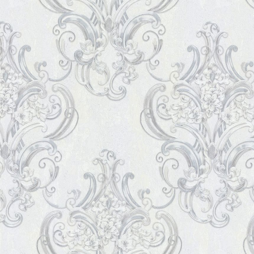 Light gray silver luxury non-woven baroque wallpaper with a distinctive ornamental pattern.