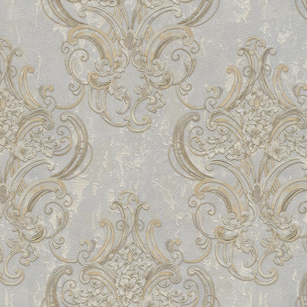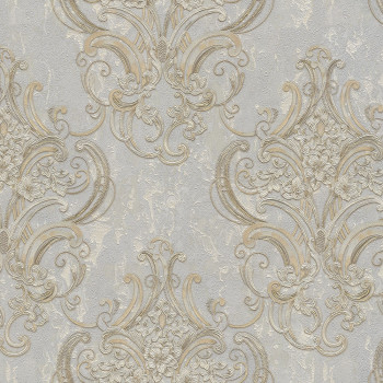 Light gray silver and gold luxury non-woven baroque wallpaper with a distinctive ornamental pattern.