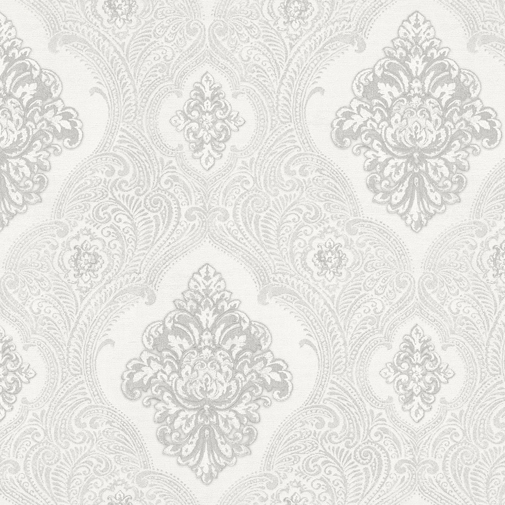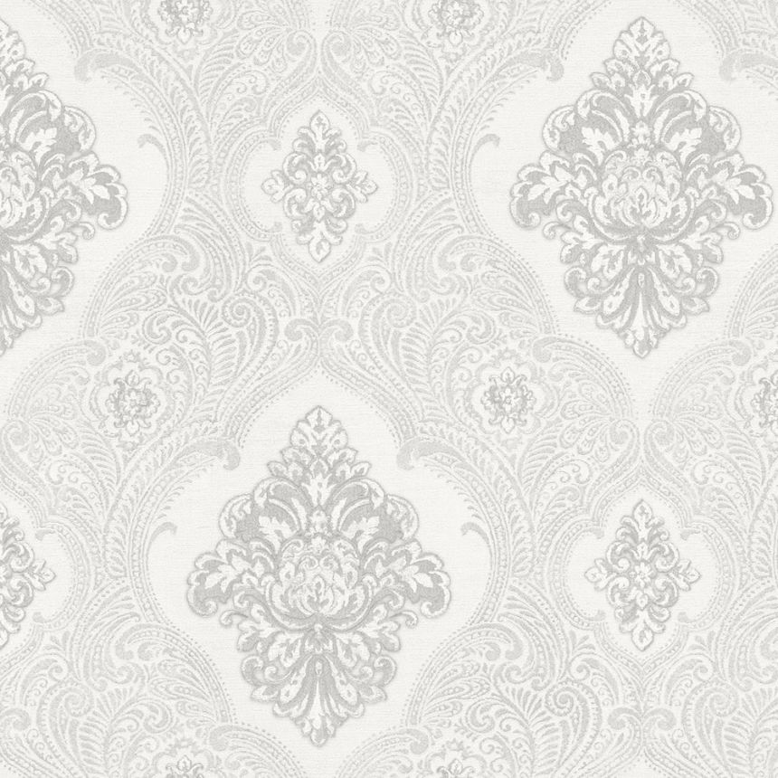 Creamy-silver luxury non-woven baroque wallpaper with a distinctive ornamental pattern.