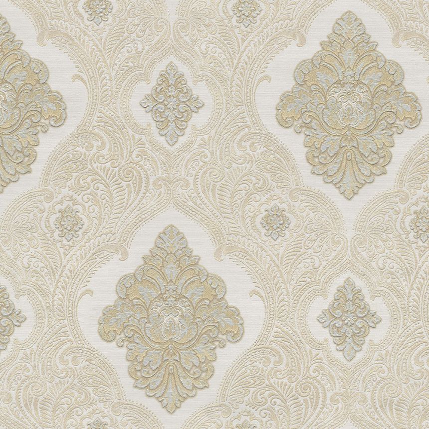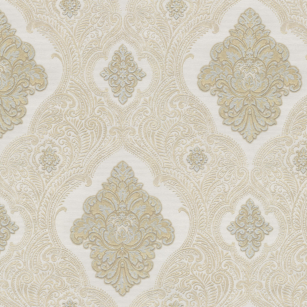 Gold-silver luxury non-woven baroque wallpaper with a distinctive ornamental pattern.