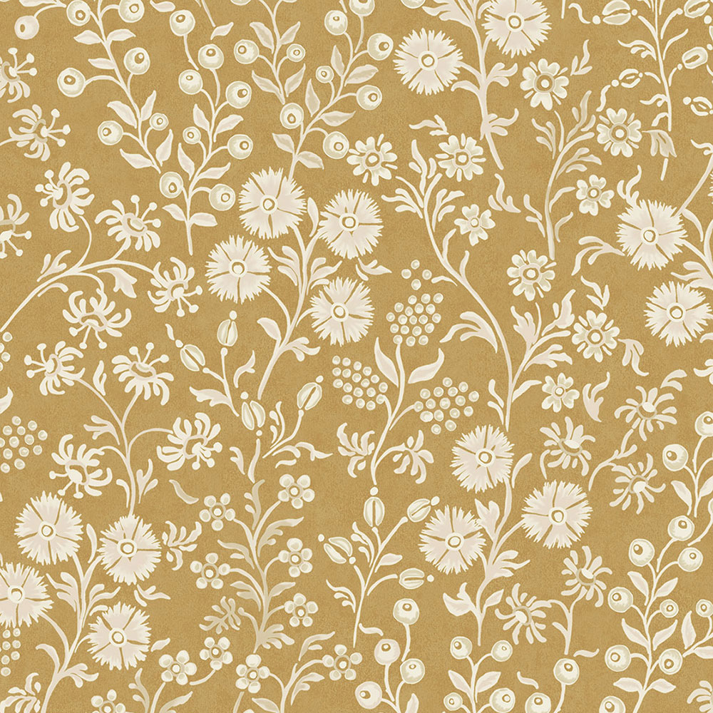 Floral wallpaper with natural motifs in beige and ochre.