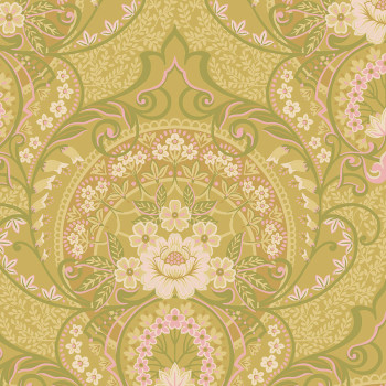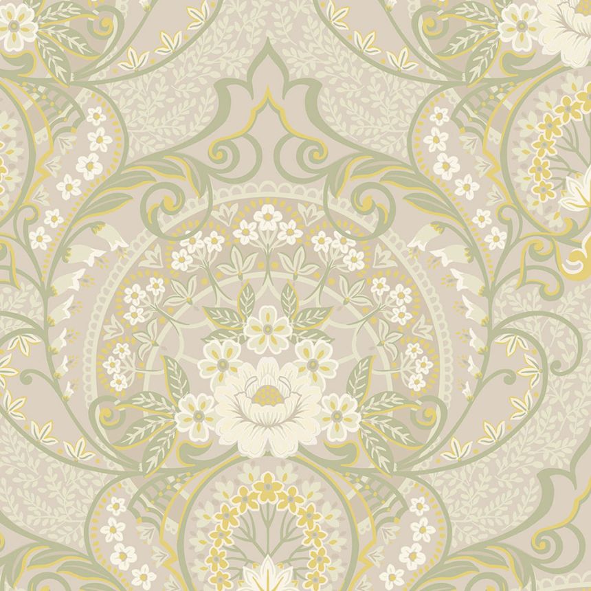 Distinctive floral pattern in soft tones of beige, green, ochre.