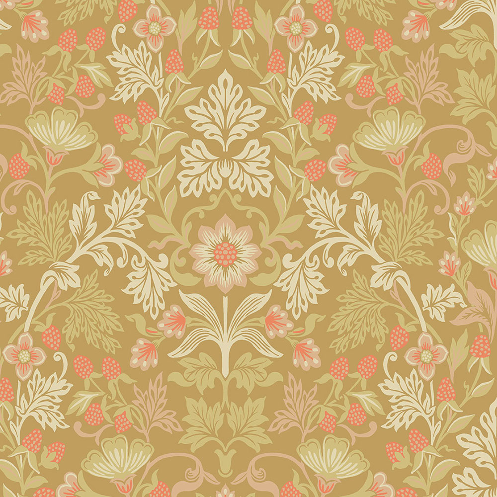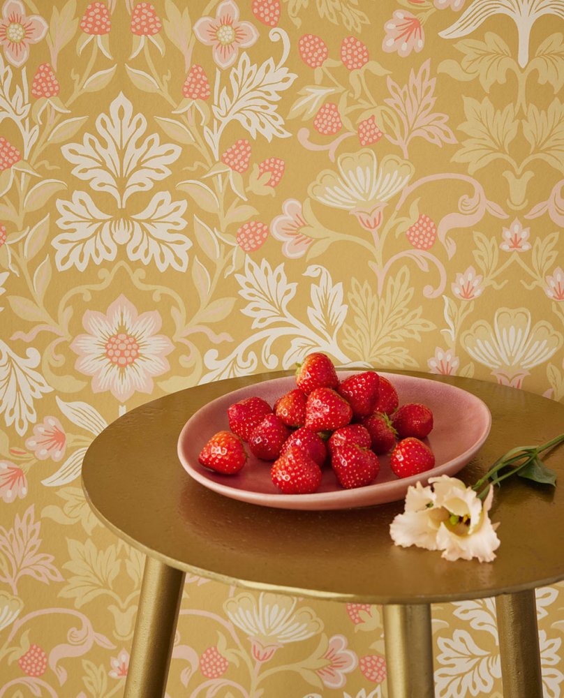 Ornamental floral wallpaper on a dark blue background with natural motifs in beige and ocher.