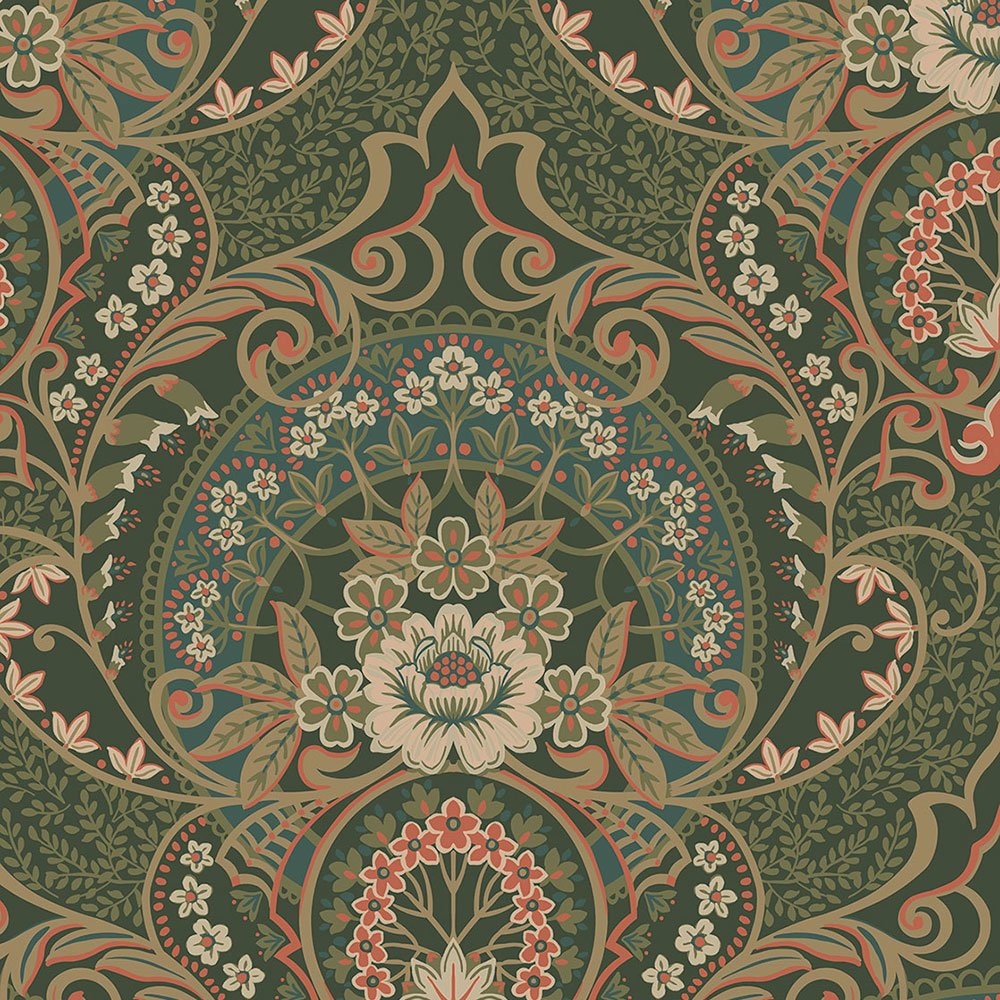 Distinctive floral pattern in pastel tones of brown, green, beige and brick.