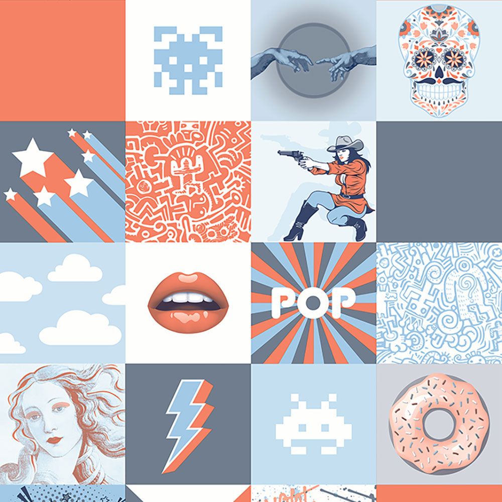 Non-woven collage wallpaper for teenagers, texts, graphic designs.