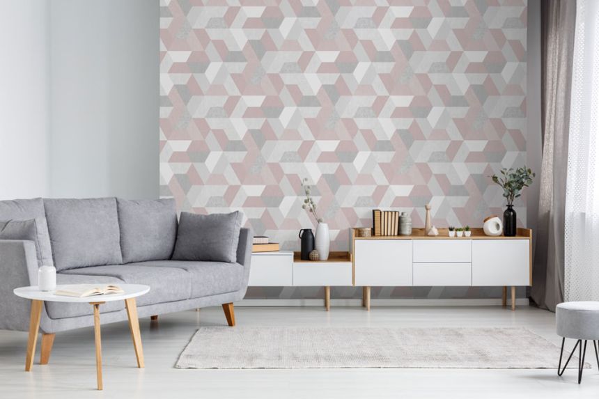 Roll width 1.06 m Non-woven wallpaper with washable vinyl surface - geometric patterns in shades of gray and pink.