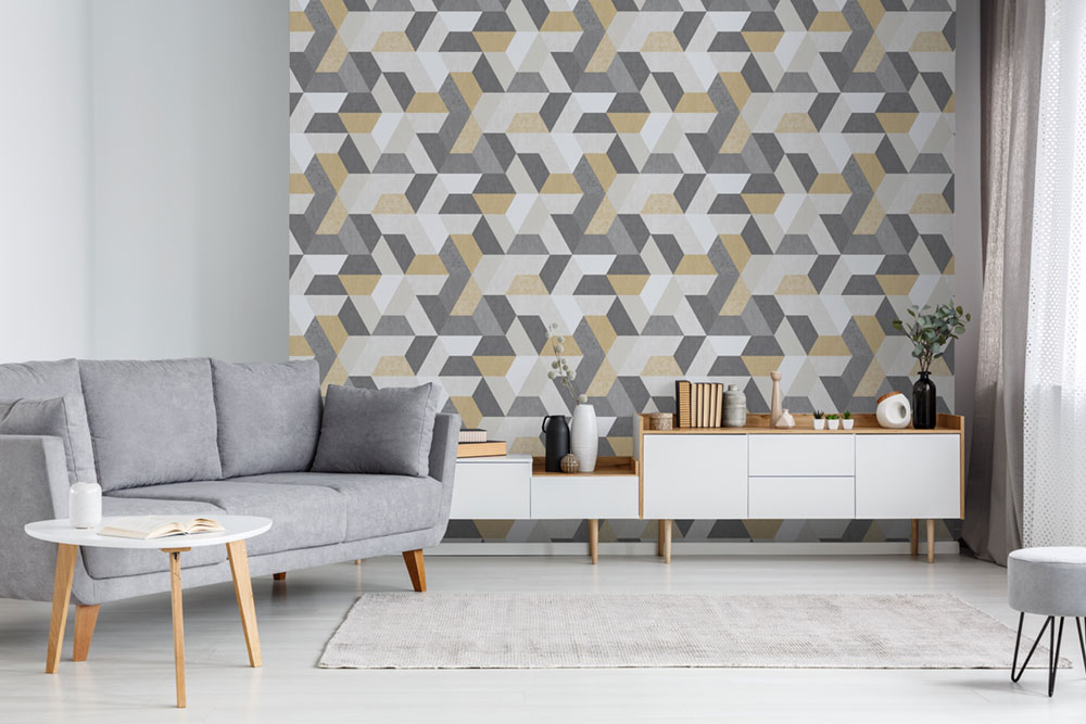 Non-woven wallpaper with washable vinyl surface - geometric patterns in shades of gray and ocher.