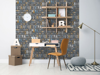 Non-woven wallpaper with washable vinyl surface - city motif, texts.