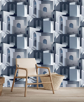 Impressive non-woven blue-gray graphic 3D wallpaper with spatial effect, arcade and stairs motif, shades of burgundy and old pink.