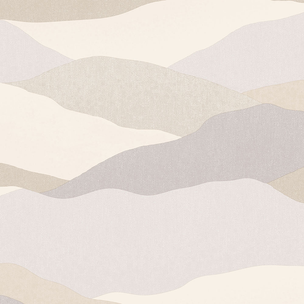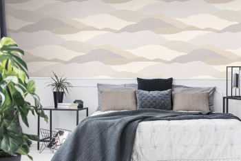 Non-woven graphic wallpaper, wave motif, mountains - shades of gray, gray-beige and white.
