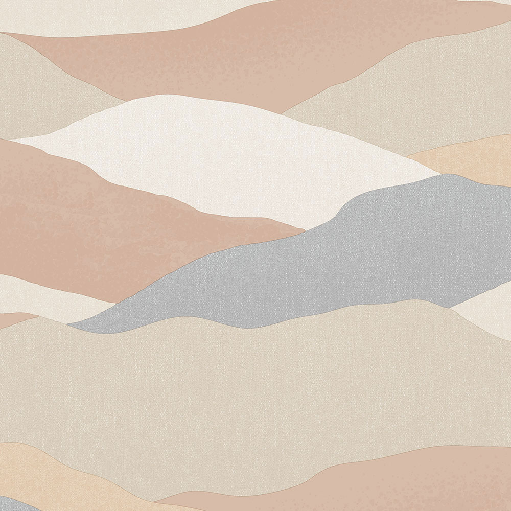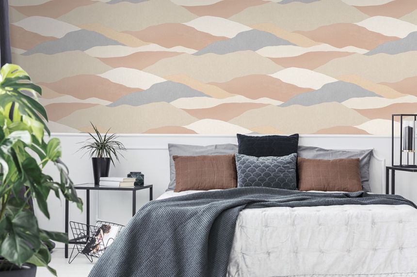 Non-woven graphic wallpaper, wave motif, mountains - shades of cream, beige, brown and gray.