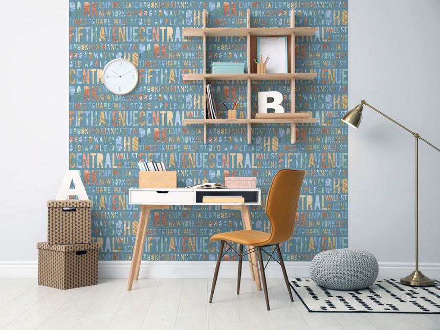 Non-woven turquoise washable wallpaper with texts - M50804, Loft, Ugépa