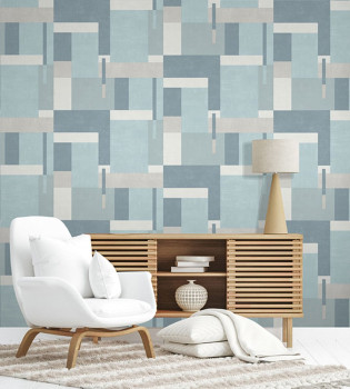 Non-woven geometric design wallpaper in Art Deco style, shades of blue and gray.