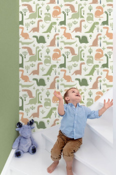 Children's non-woven wallpaper with dinosaurs - fabric texture, shades of green, brown and terracotta.