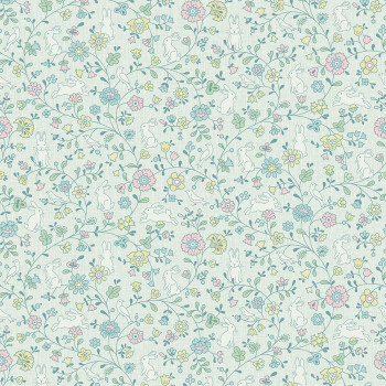 Green non-woven children's wallpaper - flowers, bunnies JS3102, Jack´N Rose 2024 , Grandeco