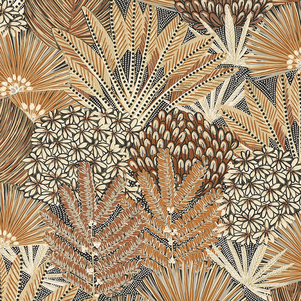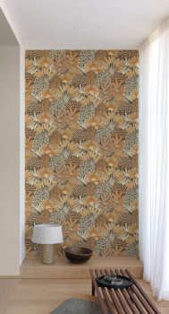 Plant and natural motifs bring peace and harmony to the interior. Finely textured non-woven wallpaper with a leaf and flower design in shades of beige, ochre and brown with golden glitters.