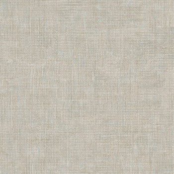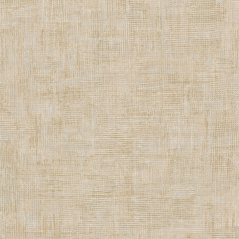 Non-woven wallpaper with textile texture in beige with blue cubes with metallic reflections.