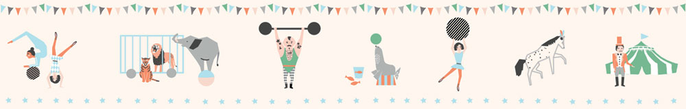 Creamy children's self-adhesive border with circus motifs. Can be asily combined with related wallpapers.
