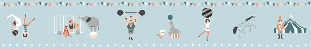 Blue children's self-adhesive border with circus motifs. Can be asily combined with related wallpapers.