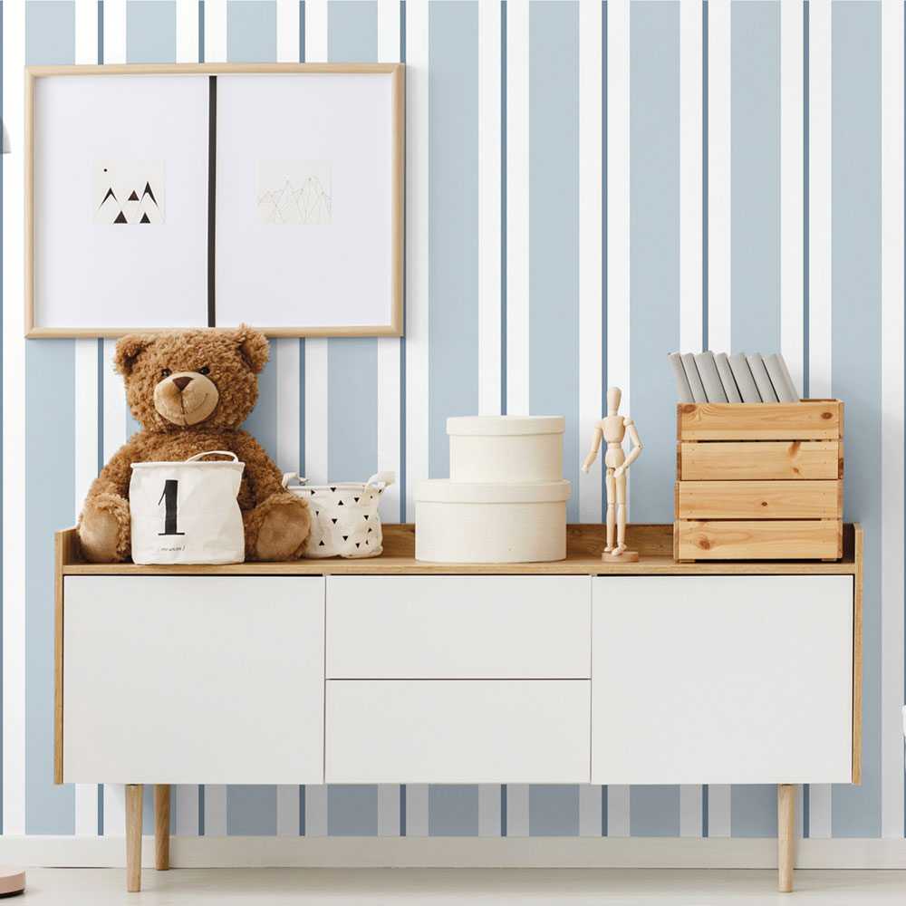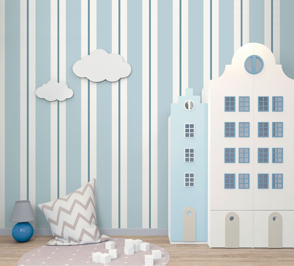 Blue and white non-woven striped wallpaper. Wallpaper not only for children's room.