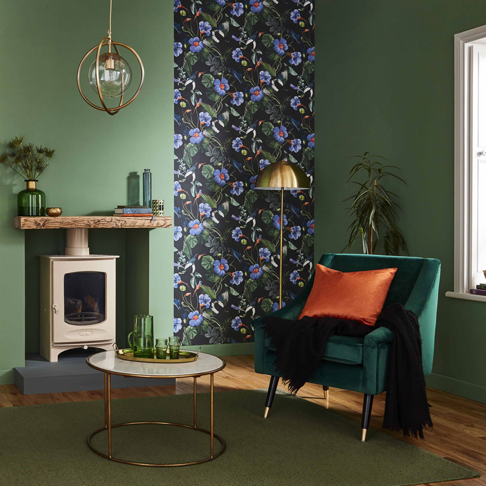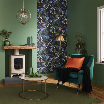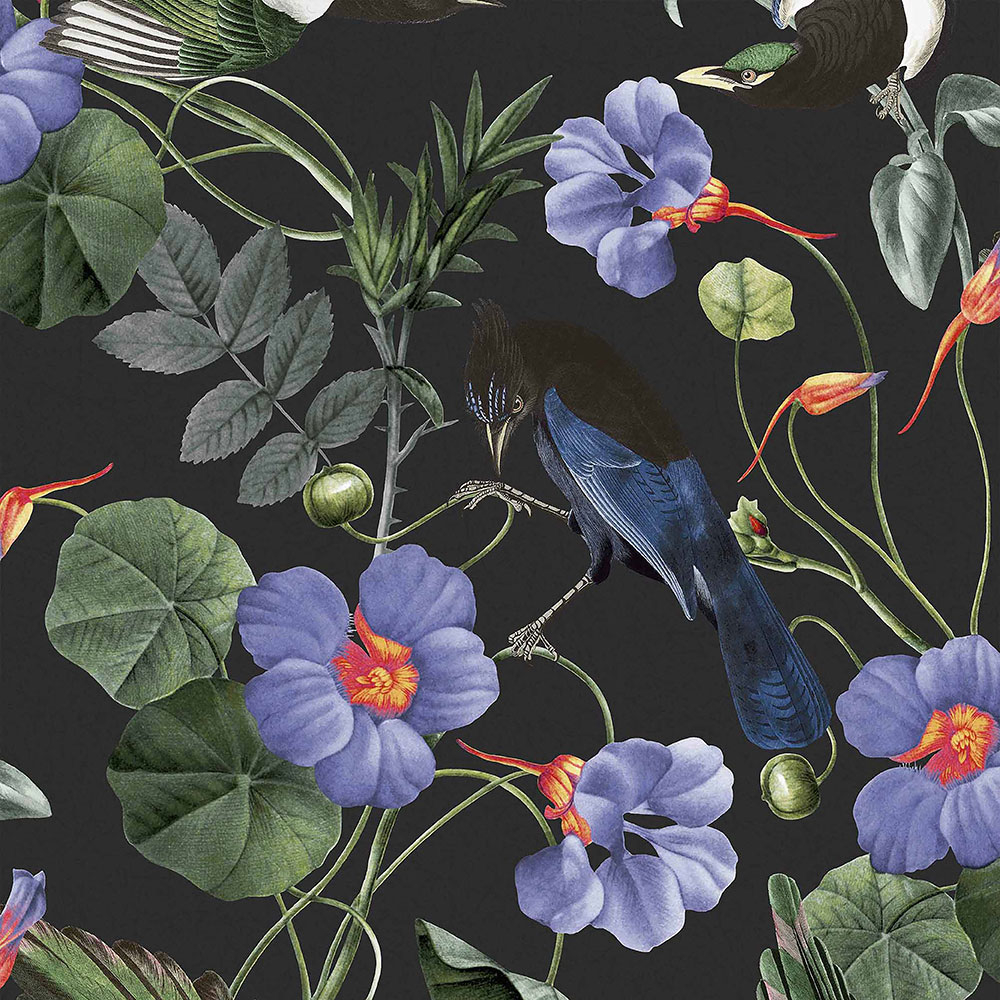 Luxury non-woven wallpaper with a motif of exotic birds, leaves, flowers in green, blue, orange shades on a black smooth background.