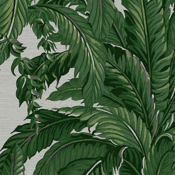 Non-woven wallpaper with a motif of large green palm leaves on a light gray background.