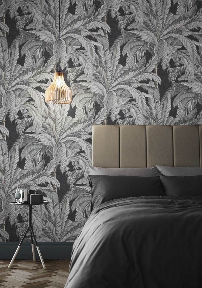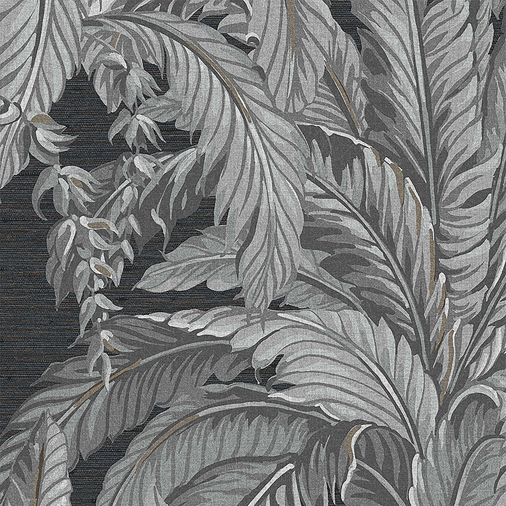 Non-woven wallpaper with a motif of large gray palm leaves on a dark gray background.