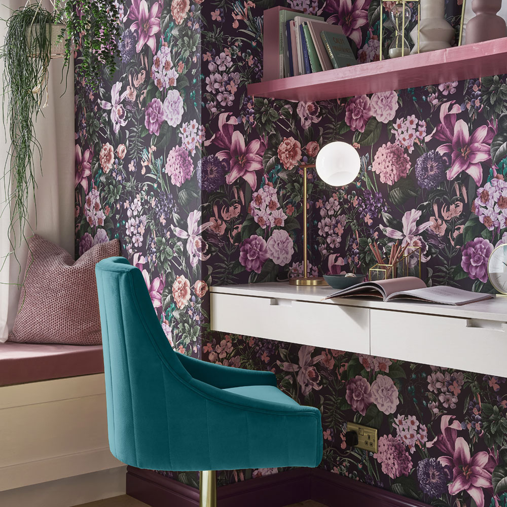 Floral non-woven wallpaper in rich shades of green, turquoise and purple on a dark purple background.