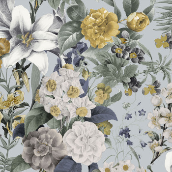 Floral non-woven wallpaper in pastel shades of green, yellow and gray on a light green background.