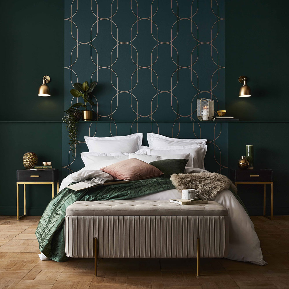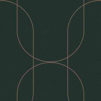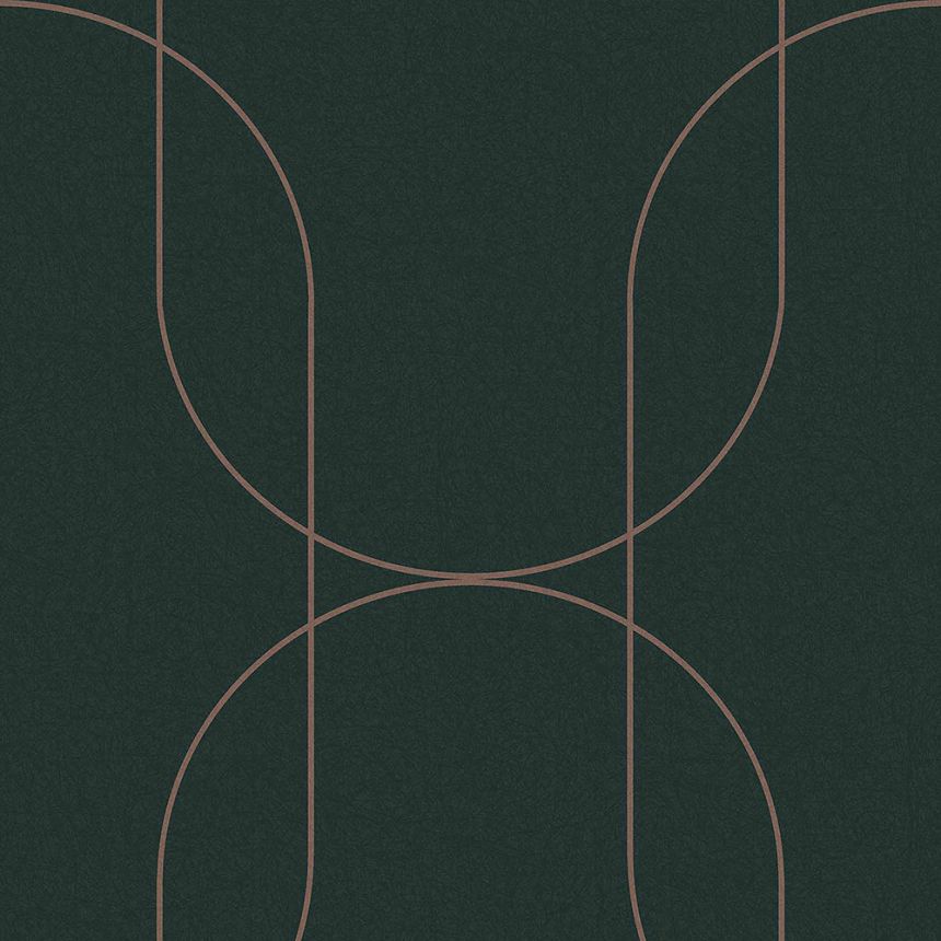 Delicate non-woven geometric design wallpaper with elegant rose gold curves on a green textured background.