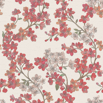 Luxury cream non-woven wallpaper - floral pattern with a metallic gloss in shades of red and pink, background imitation fine fabric.