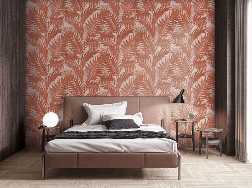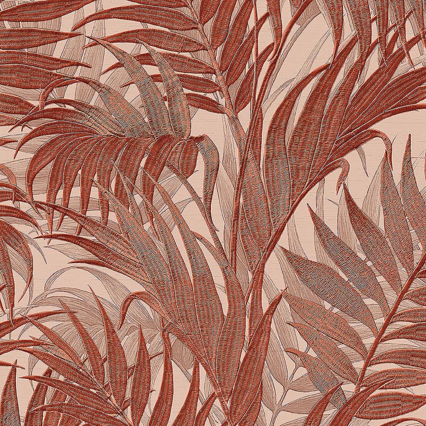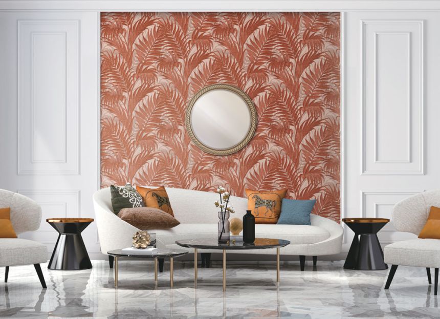 Luxury brown non-woven wallpaper - orange semi-gloss palm leaves, background imitation of fine fabric. Luxury wallpaper suitable for living room or bedroom.