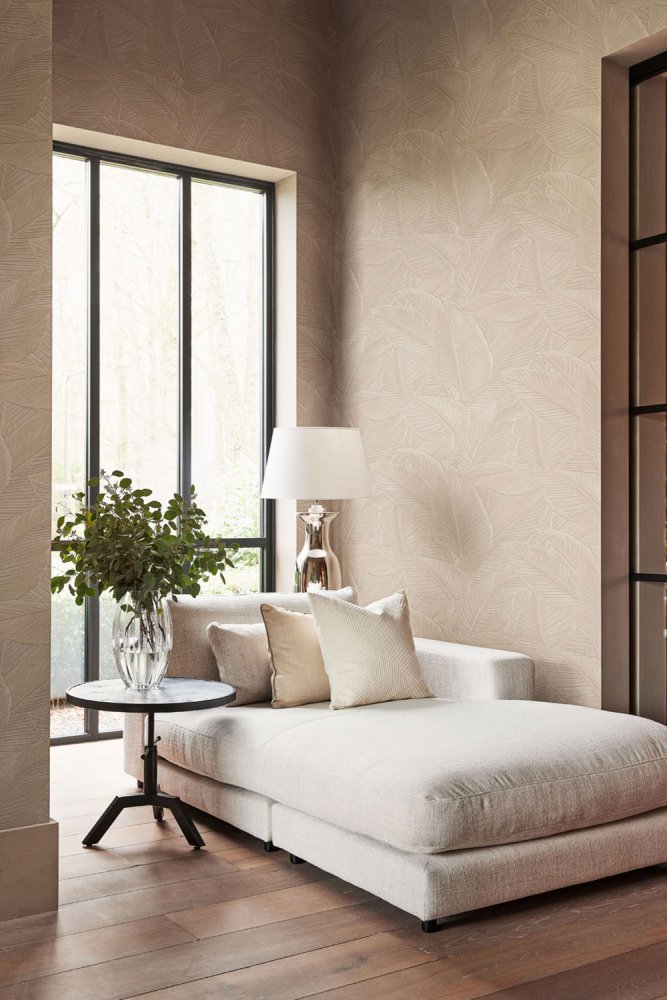 Cream non-woven wallpaper, leaf pattern. Wallpaper is suitable for living room, bedroom or study.