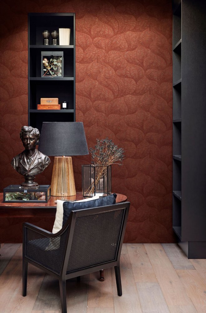 Brick red non-woven wallpaper, pattern of stylized leaves with metallic gold and silver details. Wallpaper is suitable for bedroom, living room or study.