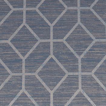 Luxury dark blue wallpaper with a metallic geometric pattern on a textured surface imitating coarse fabric.