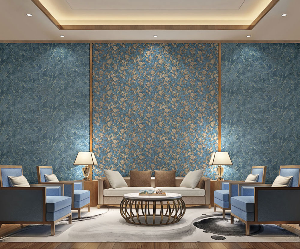 Roll width 1.06m. Gray-blue luxury non-woven wallpaper with golden glitters - vinyl surface, stucco pattern.
