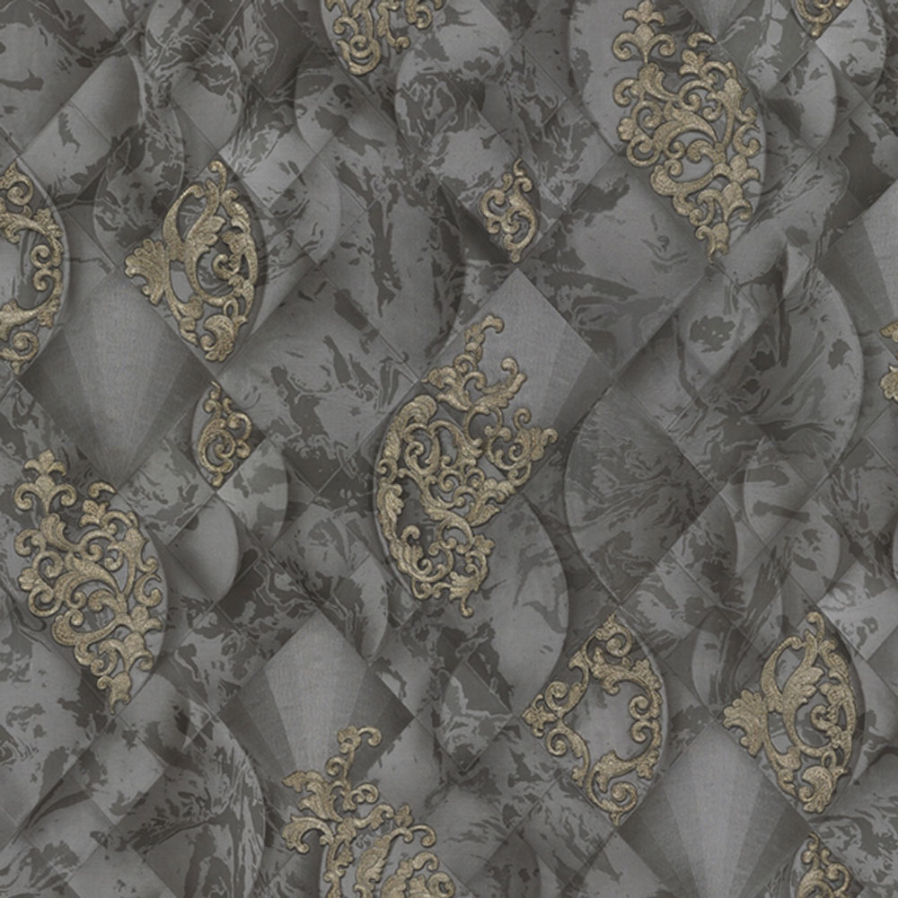 Roll width 1.06m. Gray-black luxury non-woven wallpaper - vinyl surface, geometric marbled background, baroque ornamental pattern with golden glitters.
