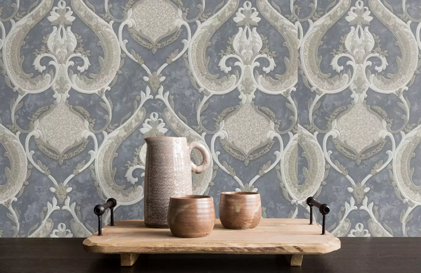 Roll width 1.06m. Luxury non-woven wallpaper - vinyl surface, gray-silver background, distinctive baroque ornamental pattern brown-gray with silver glitters.