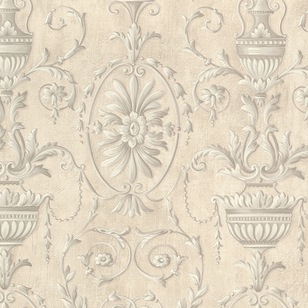 Luxury non-wovenwallpaper with baroque ornaments of flowers and vases on a coarse beige stucco background.