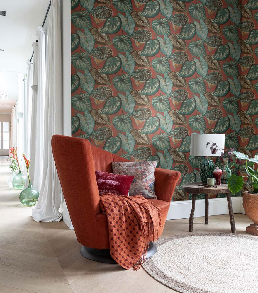 Non-woven wallpaper with a motif of large green leaves on a red-brown background with a textile structure.