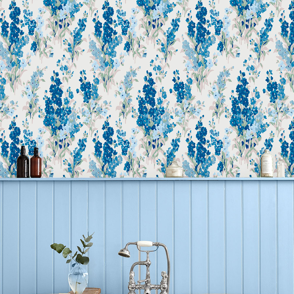 Non-woven wallpaper with a floral motif in blue on a white smooth background brings a pleasant atmosphere into the interior.