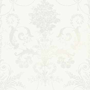 Non-woven wallpaper with light gray floral ornaments on a white smooth background brings a pleasant atmosphere into the interior.