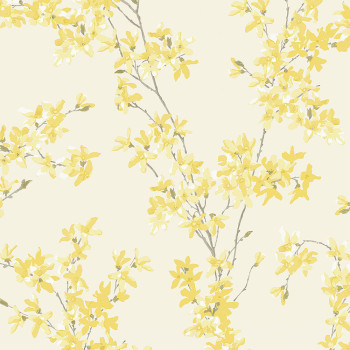 Non-woven wallpaper with laburnum sprigs on a cream smooth background brings a pleasant atmosphere into the interior.