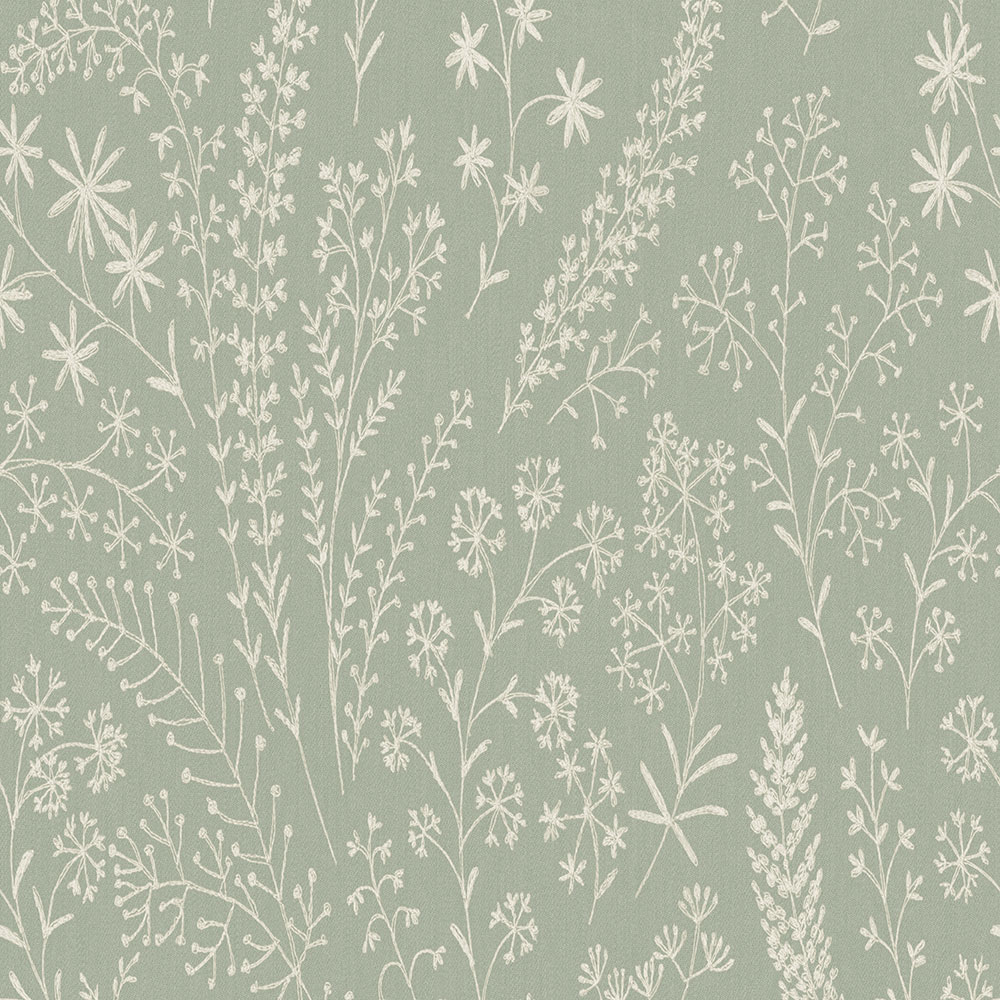 Non-woven wallpaper with white outlines of plants on a green textured background.