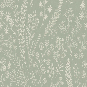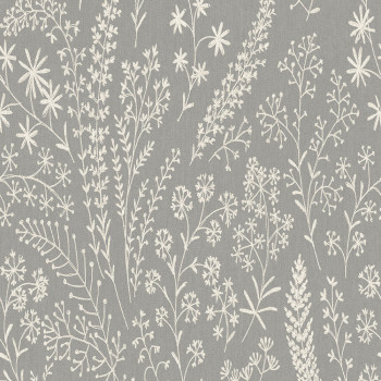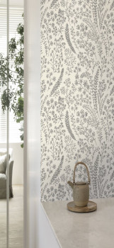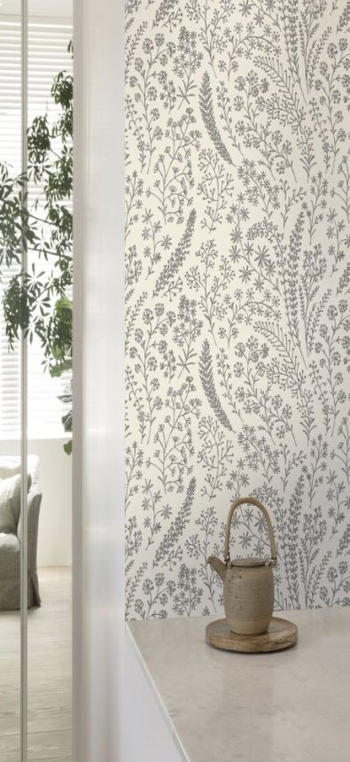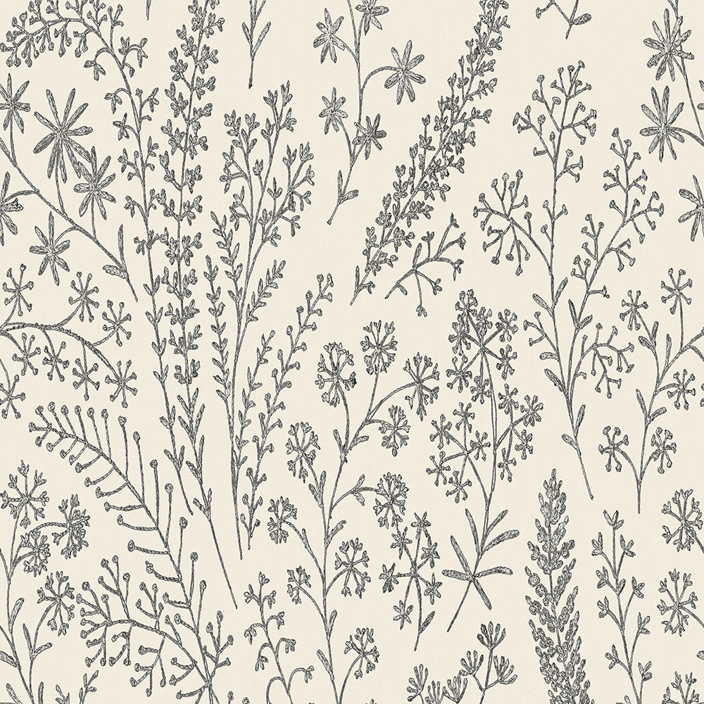 Non-woven wallpaper with black outlines of plants on a white textured background.