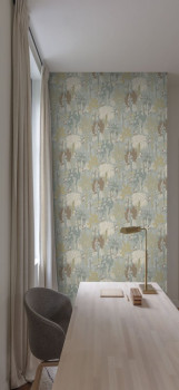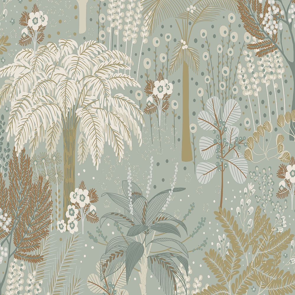 Non-woven wallpaper with a motif of palm trees and tropical trees in green and brown tones with metallic reflections.